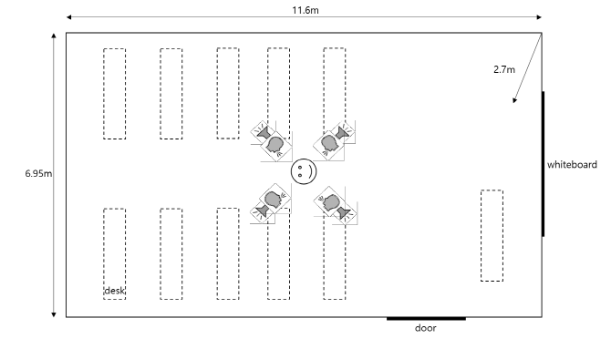 The room size for lectures is 11.6x6.95x2.7m3 and the reverberation time is about 400~500ms. The location and the direction of the target-speaker and the four loudspeakers are depicted in the figure below. Several furniture such as desks and one whiteboard are shown at the figure, but all chairs are not depicted for high visibility.